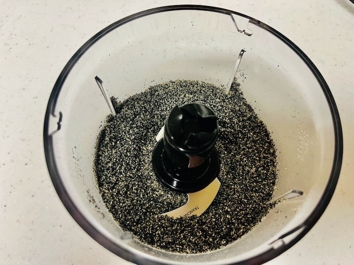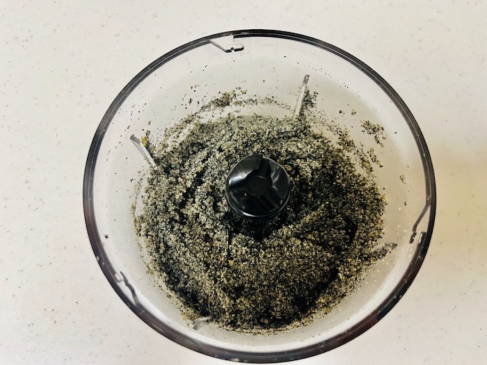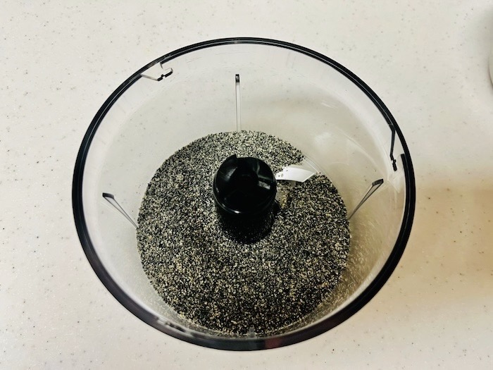 ①ミキサーに黒ごま→くるみ→松の実の順に入れ、その都度よく混ぜるようにミキサーにかける。