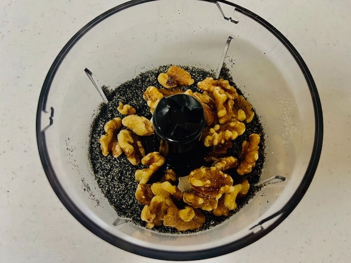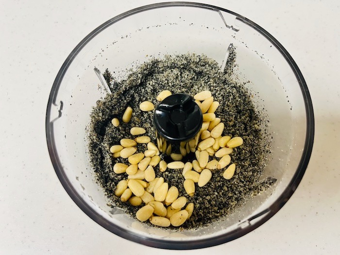 ☝️くるみをミキサーにかけたら、松の実を入れる。